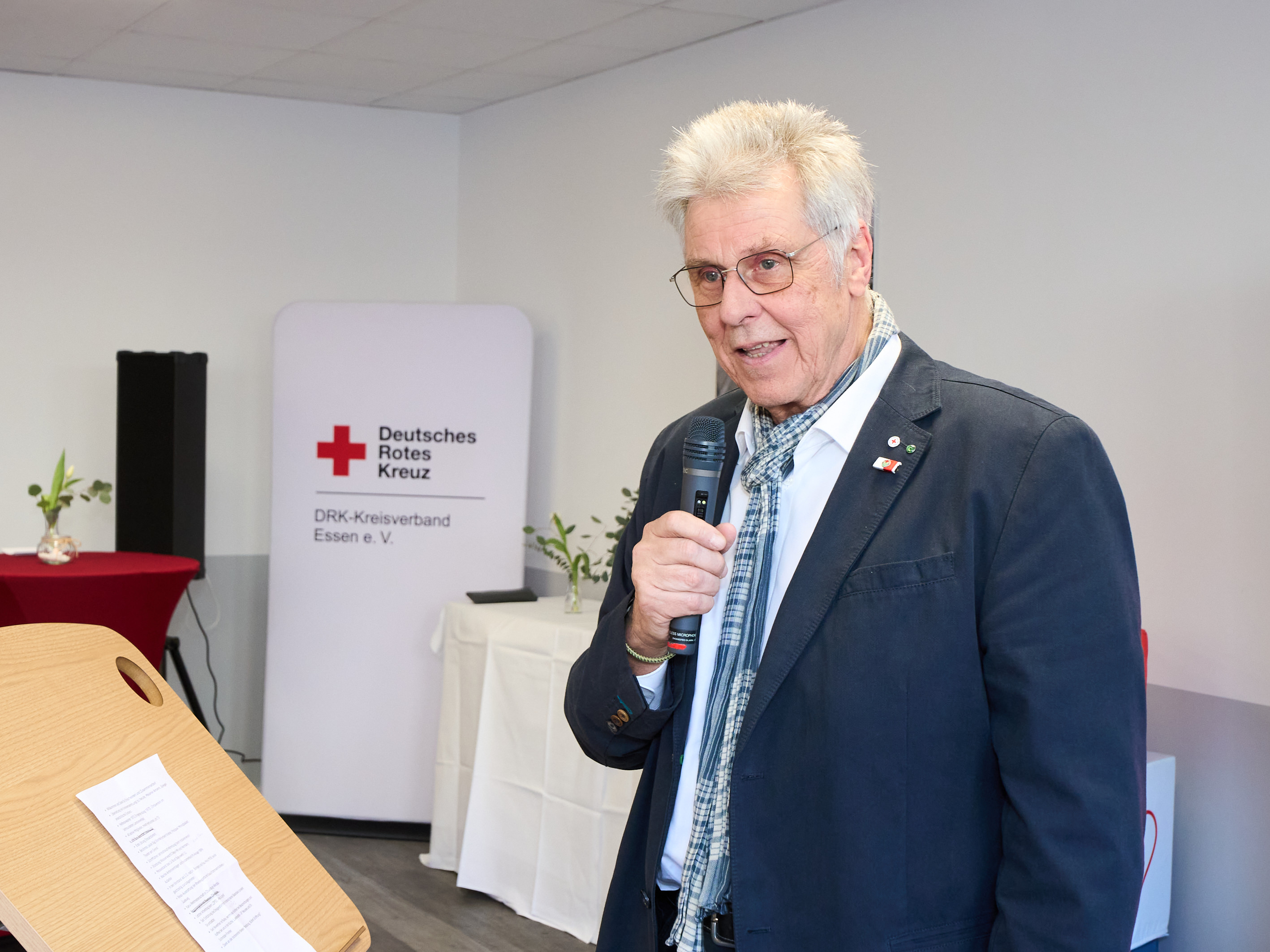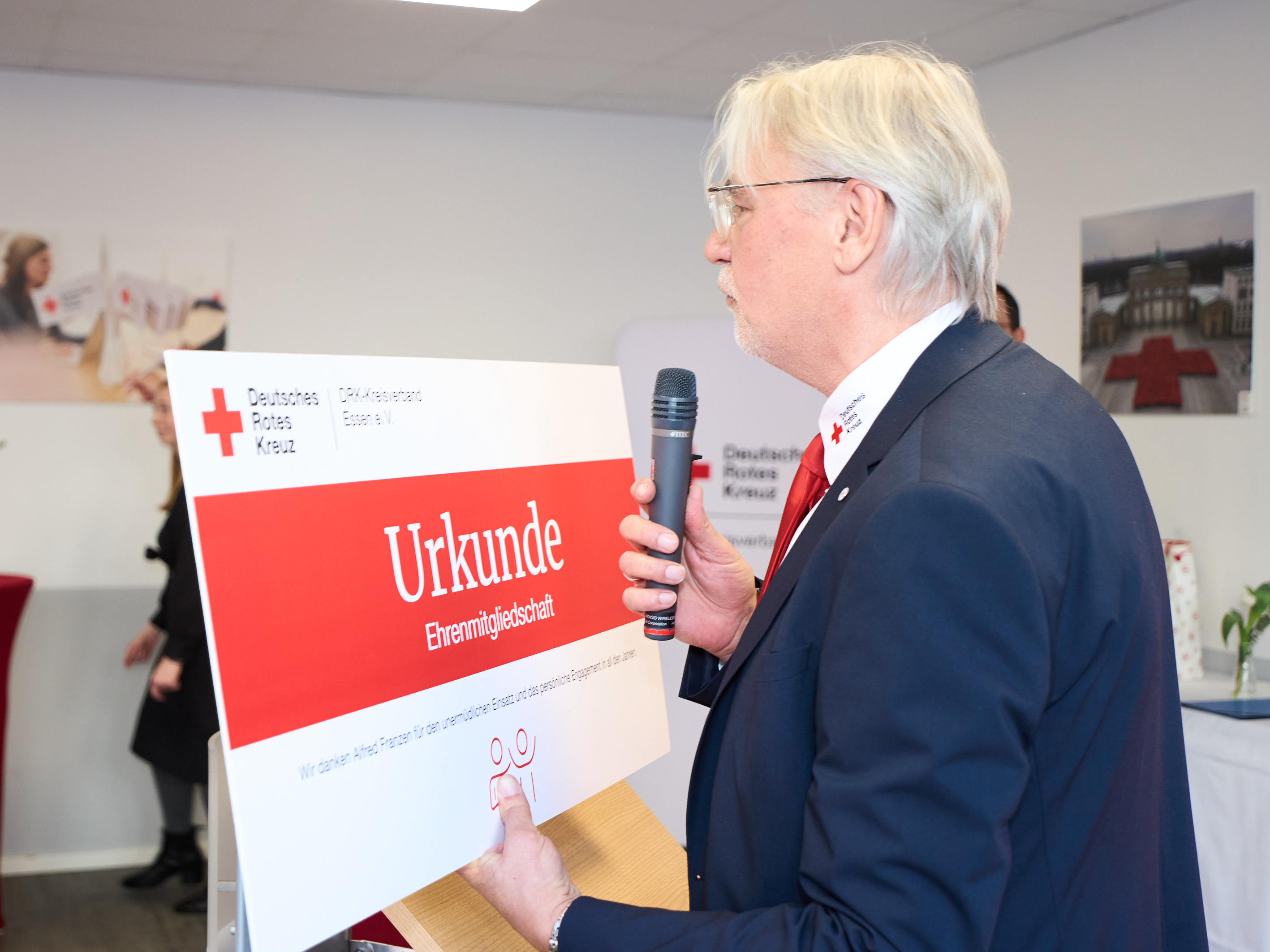 Ingo Schmidt, Vorstand des DRK-Kreisverbandes Essen, erinnerte in seiner Rede mit persönlichen Anekdoten an die vertrauensvolle Zusammenarbeit und die gemeinsame Zeit im Verband. Auch der neu gewählte Präsident, Jörg Schulz, richtete wertschätzende Worte an seinen Vorgänger und verlieh Alfred Franzen die lebenslange Ehrenmitgliedschaft im DRK-Kreisverband Essen – eine besondere Ehrung für sein jahrzehntelanges Engagement.